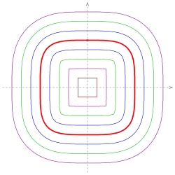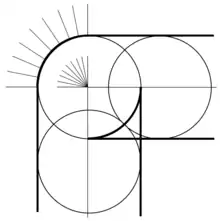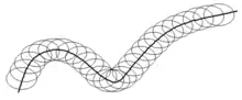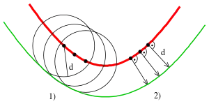 A parallel of a curve is the envelope of a family of congruent circles centered on the curve. It generalises the concept of parallel (straight) lines. It can also be defined as a curve whose points are at a constant normal distance from a given curve.[1] These two definitions are not entirely equivalent as the latter assumes smoothness, whereas the former does not.[2]