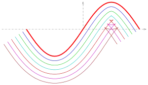Except in the case of a line or circle, the parallel curves have a more complicated mathematical structure than the progenitor curve.[1] For example, even if the progenitor curve is smooth, its offsets may not be so; this property is illustrated in the top figure, using a sine curve as progenitor curve.[2] In general, even if a curve is rational, its offsets may not be so. For example, the offsets of a parabola are rational curves, but the offsets of an ellipse or of a hyperbola are not rational, even though these progenitor curves themselves are rational.[3]