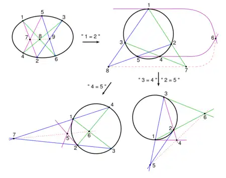 - Interactive demo of Pascal's theorem (Java required) at cut-the-knot