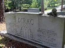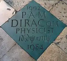 In 1984, Dirac died in Tallahassee, Florida, and was buried at Tallahassee's Roselawn Cemetery.[149] Dirac's childhood home in Bishopston, Bristol is commemorated with a blue plaque,[150] and the nearby Dirac Road is named in recognition of his links with the city of Bristol. A commemorative stone was erected in a garden in Saint-Maurice, Switzerland, the town of origin of his father's family, on 1 August 1991. On 13 November 1995 a commemorative marker, made from Burlington green slate and inscribed with the Dirac equation, was unveiled in Westminster Abbey.[149][151] The Dean of Westminster, Edward Carpenter, had initially refused permission for the memorial, thinking Dirac to be anti-Christian, but was eventually (over a five-year period) persuaded to relent.[152]