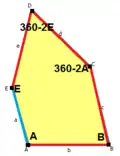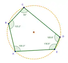 A cyclic pentagon is one for which a circle called the circumcircle goes through all five vertices. The regular pentagon is an example of a cyclic pentagon. The area of a cyclic pentagon, whether regular or not, can be expressed as one fourth the square root of one of the roots of a septic equation whose coefficients are functions of the sides of the pentagon.[11][12][13]
