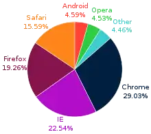 A pie chart showing the percentage by web browser visiting Wikimedia sites (April 2009 to 2012)