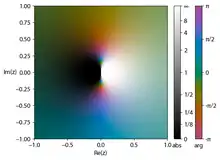 Domain coloring plot of the function exp(1z), centered on the essential singularity at z = 0. The hue of a point z represents the argument of exp(1z), the luminance represents its absolute value. This plot shows that arbitrarily close to the singularity, all non-zero values are attained.