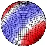 ![]() B. This view shows same potential from 180° from view A. Viewed from above the Northern Hemisphere. Red up, blue down. |