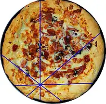 Compare with the ham sandwich theorem, a result about slicing n-dimensional objects. The two-dimensional version implies that any pizza, no matter how misshapen, can have its area and its crust length simultaneously bisected by a single carefully chosen straight-line cut. The three-dimensional version implies the existence of a plane cut that equally shares base, tomato and cheese.