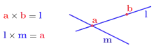 Dually, one can express the 'meet', or intersection of two straight lines by the cross-product: