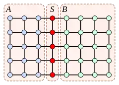 Consider a grid graph with rows and columns; the number of vertices equals . For instance, in the illustration, , , and . If is odd, there is a single central row, and otherwise there are two rows equally close to the center; similarly, if is odd, there is a single central column, and otherwise there are two columns equally close to the center. Choosing to be any of these central rows or columns, and removing from the graph, partitions the graph into two smaller connected subgraphs and , each of which has at most vertices. If (as in the illustration), then choosing a central column will give a separator with vertices, and similarly if then choosing a central row will give a separator with at most vertices. Thus, every grid graph has a separator of size at most , the removal of which partitions it into two connected components, each of size at most .[3]