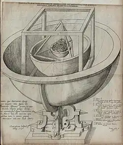 In the 16th century, the German astronomer Johannes Kepler attempted to relate the five extraterrestrial planets known at that time to the five Platonic solids. In Mysterium Cosmographicum, published in 1596, Kepler proposed a model of the Solar System in which the five solids were set inside one another and separated by a series of inscribed and circumscribed spheres. Kepler proposed that the distance relationships between the six planets known at that time could be understood in terms of the five Platonic solids enclosed within a sphere that represented the orbit of Saturn. The six spheres each corresponded to one of the planets (Mercury, Venus, Earth, Mars, Jupiter, and Saturn). The solids were ordered with the innermost being the octahedron, followed by the icosahedron, dodecahedron, tetrahedron, and finally the cube, thereby dictating the structure of the solar system and the distance relationships between the planets by the Platonic solids. In the end, Kepler's original idea had to be abandoned, but out of his research came his three laws of orbital dynamics, the first of which was that the orbits of planets are ellipses rather than circles, changing the course of physics and astronomy.[6] He also discovered the Kepler solids, which are two nonconvex regular polyhedra.
