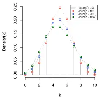 The Poisson distribution is also the limit of a binomial distribution, for which the probability of success for each trial equals λ divided by the number of trials, as the number of trials approaches infinity (see Related distributions).