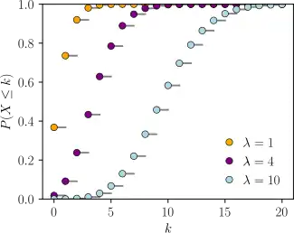 Cumulative distribution function ![]() The horizontal axis is the index k, the number of occurrences. The CDF is discontinuous at the integers of k and flat everywhere else because a variable that is Poisson distributed takes on only integer values. | |||