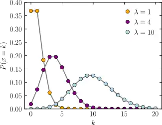 Probability mass function ![]() The horizontal axis is the index k, the number of occurrences. λ is the expected rate of occurrences. The vertical axis is the probability of k occurrences given λ. The function is defined only at integer values of k; the connecting lines are only guides for the eye. | |||