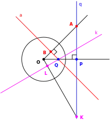 The relationship between poles and polars is reciprocal. Thus, if a point A lies on the polar line q of a point Q, then the point Q must lie on the polar line a of the point A. The two polar lines a and q need not be parallel.