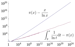 The logarithmic integral li(x) is larger than π(x) for "small" values of x. This is because it is (in some sense) counting not primes, but prime powers, where a power pn of a prime p is counted as 1/ n of a prime. This suggests that li(x) should usually be larger than π(x) by roughly and in particular should always be larger than π(x). However, in 1914, J. E. Littlewood proved that changes sign infinitely often.[23] The first value of x where π(x) exceeds li(x) is probably around x ~ 10316 ; see the article on Skewes' number for more details. (On the other hand, the offset logarithmic integral Li(x) is smaller than π(x) already for x = 2; indeed, Li(2) = 0, while π(2) = 1.)