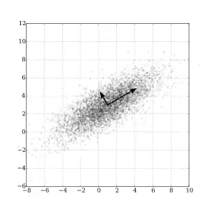 The principal components of a collection of points in a real coordinate space are a sequence of unit vectors, where the -th vector is the direction of a line that best fits the data while being orthogonal to the first vectors. Here, a best-fitting line is defined as one that minimizes the average squared perpendicular distance from the points to the line. These directions (i.e., principal components) constitute an orthonormal basis in which different individual dimensions of the data are linearly uncorrelated. Many studies use the first two principal components in order to plot the data in two dimensions and to visually identify clusters of closely related data points.[1]