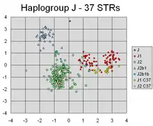 PCA has successfully found linear combinations of the markers that separate out different clusters corresponding to different lines of individuals' Y-chromosomal genetic descent.