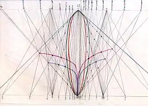 Projective geometry is an elementary non-metrical form of geometry, meaning that it does not support any concept of distance. In two dimensions it begins with the study of configurations of points and lines. That there is indeed some geometric interest in this sparse setting was first established by Desargues and others in their exploration of the principles of perspective art.[1] In higher dimensional spaces there are considered hyperplanes (that always meet), and other linear subspaces, which exhibit the principle of duality. The simplest illustration of duality is in the projective plane, where the statements "two distinct points determine a unique line" (i.e. the line through them) and "two distinct lines determine a unique point" (i.e. their point of intersection) show the same structure as propositions. Projective geometry can also be seen as a geometry of constructions with a straight-edge alone.[2] Since projective geometry excludes compass constructions, there are no circles, no angles, no measurements, no parallels, and no concept of intermediacy (or "betweenness").[3] It was realised that the theorems that do apply to projective geometry are simpler statements. For example, the different conic sections are all equivalent in (complex) projective geometry, and some theorems about circles can be considered as special cases of these general theorems.