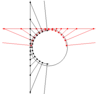 in both directions. The image represents the projective line as a circle where antipodal points are identified, and shows the two homeomorphisms of a real line to the projective line; as antipodal points are identified, the image of each line is represented as an open half circle, which can be identified with the projective line with a single point removed.