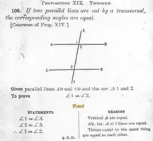 A particular way of organising a proof using two parallel columns is often used as a mathematical exercise in elementary geometry classes in the United States.[27] The proof is written as a series of lines in two columns. In each line, the left-hand column contains a proposition, while the right-hand column contains a brief explanation of how the corresponding proposition in the left-hand column is either an axiom, a hypothesis, or can be logically derived from previous propositions. The left-hand column is typically headed "Statements" and the right-hand column is typically headed "Reasons".[28]