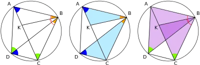 Let ABCD be a cyclic quadrilateral. On the chord BC, the inscribed angles ∠BAC = ∠BDC, and on AB, ∠ADB = ∠ACB. Construct K on AC such that ∠ABK = ∠CBD; since ∠ABK + ∠CBK = ∠ABC = ∠CBD + ∠ABD, ∠CBK = ∠ABD.