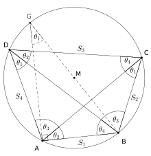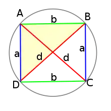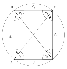 In Euclidean geometry, Ptolemy's theorem is a relation between the four sides and two diagonals of a cyclic quadrilateral (a quadrilateral whose vertices lie on a common circle). The theorem is named after the Greek astronomer and mathematician Ptolemy (Claudius Ptolemaeus).[1] Ptolemy used the theorem as an aid to creating his table of chords, a trigonometric table that he applied to astronomy.