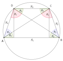 Let and . Then (since opposite angles of a cyclic quadrilateral are supplementary). Then:[10]