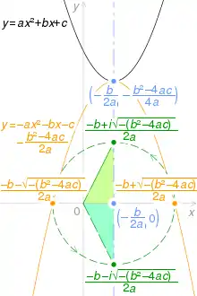 If the parabola does not intersect the x-axis, there are two complex conjugate roots. Although these roots cannot be visualized on the graph, their real and imaginary parts can be.[17]