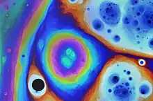 Photograph of 1.5cm x 1cm region of soap film under white light. Varying film thickness and viewing geometry determine which colours undergo constructive or destructive interference. Small bubbles significantly affect surrounding film thickness.