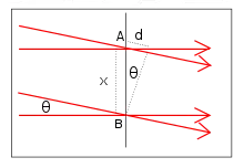 A simple form of interference pattern is obtained if two plane waves of the same frequency intersect at an angle. Interference is essentially an energy redistribution process. The energy which is lost at the destructive interference is regained at the constructive interference. One wave is travelling horizontally, and the other is travelling downwards at an angle θ to the first wave. Assuming that the two waves are in phase at the point B, then the relative phase changes along the x-axis. The phase difference at the point A is given by