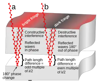 Creation of interference fringes by an optical flat on a reflective surface. Light rays from a monochromatic source pass through the glass and reflect off both the bottom surface of the flat and the supporting surface. The tiny gap between the surfaces means the two reflected rays have different path lengths. In addition the ray reflected from the bottom plate undergoes a 180° phase reversal. As a result, at locations (a) where the path difference is an odd multiple of λ/2, the waves reinforce. At locations (b) where the path difference is an even multiple of λ/2 the waves cancel. Since the gap between the surfaces varies slightly in width at different points, a series of alternating bright and dark bands, interference fringes, are seen.