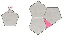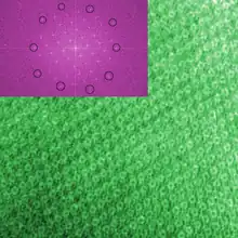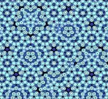 A quasiperiodic crystal, or quasicrystal, is a structure that is ordered but not periodic. A quasicrystalline pattern can continuously fill all available space, but it lacks translational symmetry.[2] While crystals, according to the classical crystallographic restriction theorem, can possess only two-, three-, four-, and six-fold rotational symmetries, the Bragg diffraction pattern of quasicrystals shows sharp peaks with other symmetry orders—for instance, five-fold.[3]