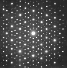 Shechtman first observed ten-fold electron diffraction patterns in 1982, while conducting a routine study of an aluminium–manganese alloy, Al6Mn, at the US National Bureau of Standards (later NIST).[21] Shechtman related his observation to Ilan Blech, who responded that such diffractions had been seen before.[22][23][24] Around that time, Shechtman also related his finding to John W. Cahn of the NIST, who did not offer any explanation and challenged him to solve the observation. Shechtman quoted Cahn as saying: "Danny, this material is telling us something, and I challenge you to find out what it is".[25]