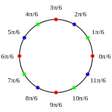 The twelfth roots of unity, which are points on the complex unit circle, form a multiplicative abelian group , shown on the picture on the right as colored balls with the number at each point giving its complex argument. Consider its subgroup made of the fourth roots of unity, shown as red balls. This normal subgroup splits the group into three cosets, shown in red, green and blue. One can check that the cosets form a group of three elements (the product of a red element with a blue element is blue, the inverse of a blue element is green, etc.). Thus, the quotient group is the group of three colors, which turns out to be the cyclic group with three elements.