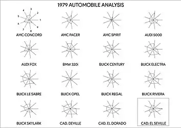 We can look at these plots individually or we can use them to identify clusters of cars with similar features. For example, we can look at the star plot of the Cadillac Seville (the last one on the image) and see that it is one of the most expensive cars, gets below average (but not among the worst) gas mileage, has an average repair record, and has average-to-above-average roominess and size. We can then compare the Cadillac models (the last three plots) with the AMC models (the first three plots). This comparison shows distinct patterns. The AMC models tend to be inexpensive, have below average gas mileage, and are small in both height and weight and in roominess. The Cadillac models are expensive, have poor gas mileage, and are large in both size and roominess.[5]