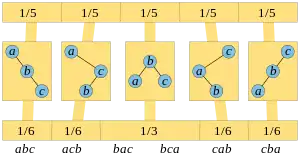 Two random distributions on three-vertex binary trees, the binary search trees on three keys a, b, and c. These five trees are each assigned probability 1/5 by the uniform distribution (top). The distribution generated by random insertion orderings (bottom) assigns the center tree probability 1/3, because two of the six possible insertion orderings generate the same tree; the other four trees have probability 1/6.