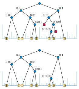 A binary trie and radix tree for the same data, eight numbers in the unit interval. The labels are prefixes of the binary representations of the numbers, shared by two or more of the numbers.