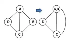 Recall that the contraction of two nodes, u and v, in a (multi-)graph yields a new node u ' with edges that are the union of the edges incident on either u or v, except from any edge(s) connecting u and v. Figure 1 gives an example of contraction of vertex A and B. After contraction, the resulting graph may have parallel edges, but contains no self loops.