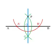 - Step 1 (red): construct a circle with center at P and some fixed radius r to create points A′ and B′ on the line AB, which will be equidistant from P.