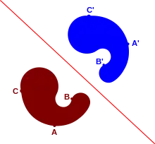 In mathematics, a reflection (also spelled reflexion)[1] is a mapping from a Euclidean space to itself that is an isometry with a hyperplane as a set of fixed points; this set is called the axis (in dimension 2) or plane (in dimension 3) of reflection. The image of a figure by a reflection is its mirror image in the axis or plane of reflection. For example the mirror image of the small Latin letter p for a reflection with respect to a vertical axis (a vertical reflection) would look like q. Its image by reflection in a horizontal axis (a horizontal reflection) would look like b. A reflection is an involution: when applied twice in succession, every point returns to its original location, and every geometrical object is restored to its original state.