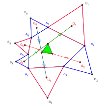 If an equilateral triangle is constructed externally on each side of any hexagon, then the midpoints of the segments connecting the centroids of opposite triangles form another equilateral triangle.[10]: Thm. 1