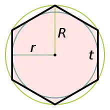 The maximal diameter (which corresponds to the long diagonal of the hexagon), D, is twice the maximal radius or circumradius, R, which equals the side length, t. The minimal diameter or the diameter of the inscribed circle (separation of parallel sides, flat-to-flat distance, short diagonal or height when resting on a flat base), d, is twice the minimal radius or inradius, r. The maxima and minima are related by the same factor: