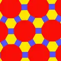There is no Platonic solid made of only regular hexagons, because the hexagons tessellate, not allowing the result to "fold up". The Archimedean solids with some hexagonal faces are the truncated tetrahedron, truncated octahedron, truncated icosahedron (of soccer ball and fullerene fame), truncated cuboctahedron and the truncated icosidodecahedron. These hexagons can be considered truncated triangles, with Coxeter diagrams of the form ![]()