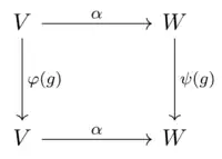 for all g in G and v in V. In terms of φ: G → GL(V) and ψ: G → GL(W), this means