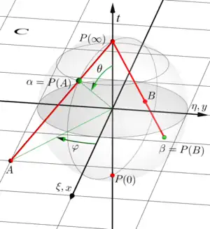 In this case, the equivalence class is written using projective coordinates. Given any point in the complex projective line, one of and must be non-zero, say . Then by the notion of equivalence, , which is in a chart for the Riemann sphere manifold.[3]