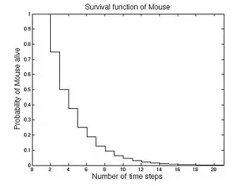 As State 5 is an absorbing state, the distribution of time to absorption is discrete phase-type distributed. Suppose the system starts in state 2, represented by the vector . The states where the mouse has perished don't contribute to the survival average so state five can be ignored. The initial state and transition matrix can be reduced to,