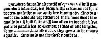 - Robert Recorde, The Whetstone of Witte (London, England: John Kyngstone, 1557), p. 236 (although the pages of this book are not numbered). From the chapter titled "The rule of equation, commonly called Algebers Rule" (p. 236): "Howbeit, for easie alteration of equations. I will propounde a fewe examples, bicause the extraction of their rootes, maie the more aptly bee wroughte. And to avoide the tediouse repetition of these woordes: is equalle to: I will sette as I doe often in worke use, a paire of paralleles, or Gemowe [twin, from gemew, from the French gemeau (twin / twins), from the Latin gemellus (little twin)] lines of one lengthe, thus: = , bicause noe .2. thynges, can be moare equalle." (However, for easy manipulation of equations, I will present a few examples in order that the extraction of roots may be more readily done. And to avoid the tedious repetition of these words "is equal to", I will substitute, as I often do when working, a pair of parallels or twin lines of the same length, thus: = , because no two things can be more equal.)