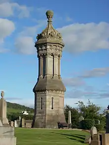 Subscriptions towards the erection of a monument to Dr Simson were collected in 1865, with the Senate of the College of Glasgow, the (thirteenth) Earl of Eglinton and Winton, and the Earl Stanhope each donating £10; and John Carrick Moore – the first cousin twice removed of Robert Simson – giving £15.[10] The memorial, designed by Frederick Thomas Pilkington, is “a large octagonal monument with carved Egyptian details, topped with a ball finial”.[11] It is situated on a hilltop in West Kilbride cemetery.
