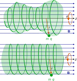 The motion of the particle in this system is helicoidal, with the axial motion uniform (constant) but the radial and angular components varying in a spiral according to the equation of motion derived above. The initial conditions on r, dr/dt, θ, dθ/dt, will determine if the trajectory of the particle has a constant r or varying r. If initially r is nonzero but dr/dt = 0, while θ and dθ/dt are arbitrary, then the initial velocity of the particle has no radial component, r is constant, so the motion will be in a perfect helix. If r is constant, the angular velocity is also constant according to the conserved pθ.