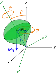 where ψ, φ, θ are the Euler angles, θ is the angle between the vertical z-axis and the top's z′-axis, ψ is the rotation of the top about its own z′-axis, and φ the azimuthal of the top's z′-axis around the vertical z-axis. The principal moments of inertia are I1 about the top's own x′ axis, I2 about the top's own y′ axes, and I3 about the top's own z′-axis. Since the top is symmetric about its z′-axis, I1 = I2. Here the simple relation for local gravitational potential energy V = Mglcosθ is used where g is the acceleration due to gravity, and the centre of mass of the top is a distance l from its tip along its z′-axis.