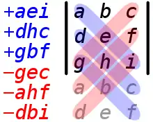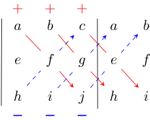 Write out the first two columns of the matrix to the right of the third column, giving five columns in a row. Then add the products of the diagonals going from top to bottom (solid) and subtract the products of the diagonals going from bottom to top (dashed). This yields[1][2]