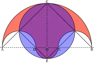 Should points D and E converge with O, it would form an arbelos, another one of Archimedes' creations, with symmetry along the y-axis.[3]